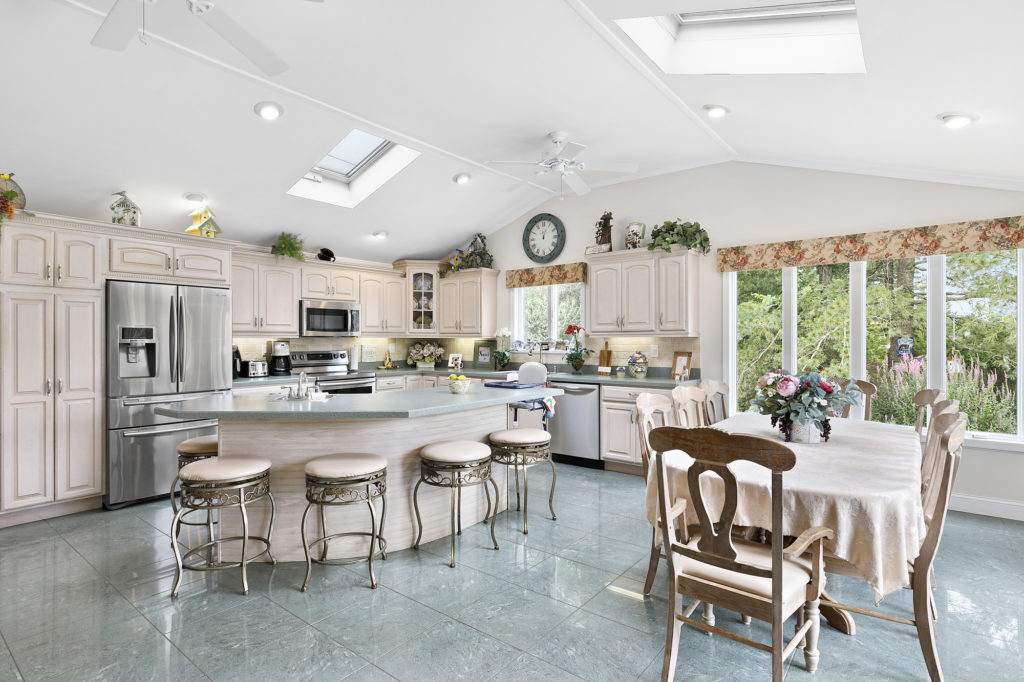 The four-bedroom, two-bathroom home features a sun-drenched kitchen with an open and spacious center island and patio access for outdoor dining. There is also a cedar sunroom perfect for morning coffee and a good book or entertaining guests with its built-in bar.