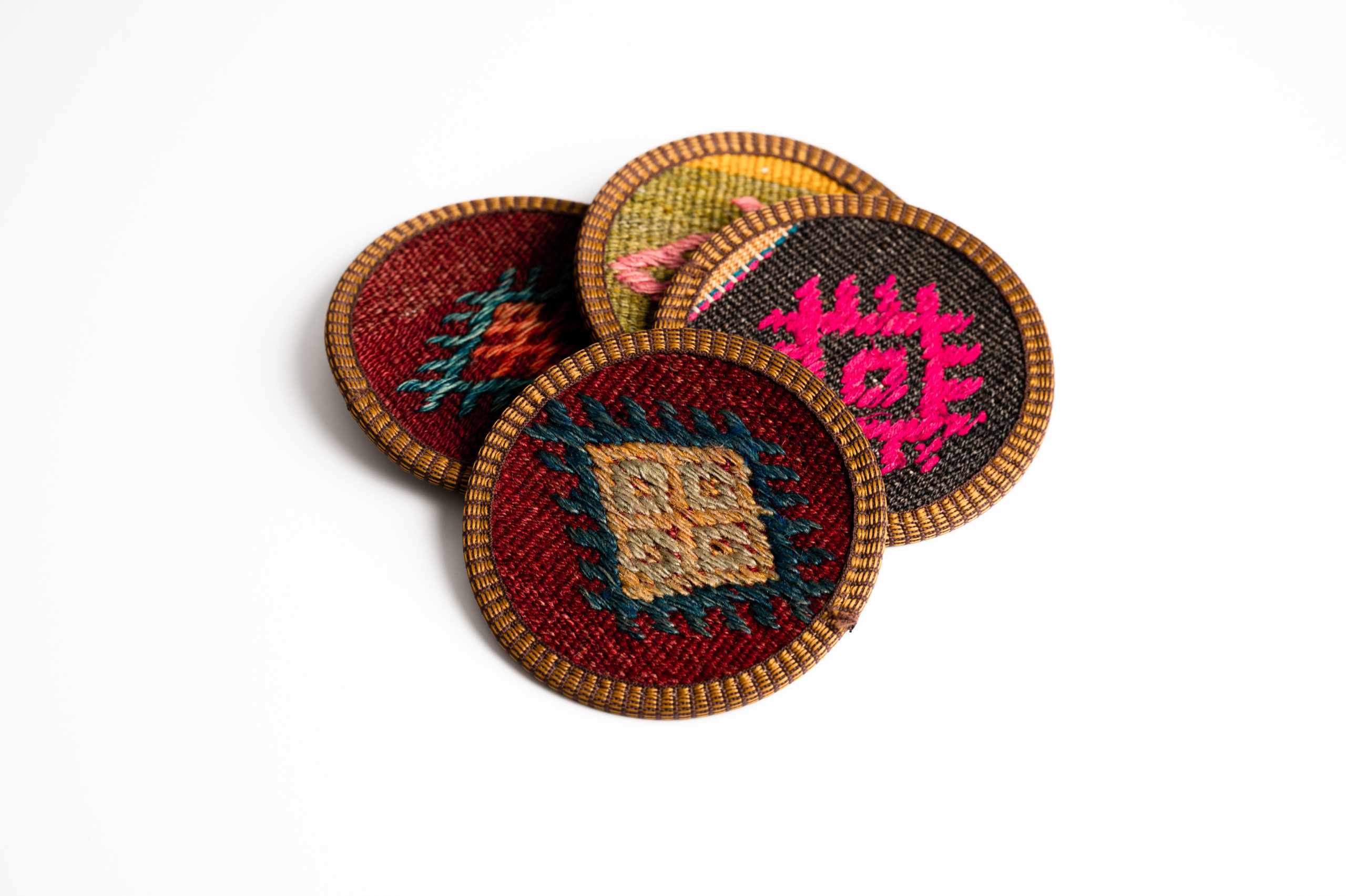 Use in your own home or as a unique hostess gift. Made from vintage kilims, no two coasters are alike and the leather backing means they’ll protect your furniture as well.