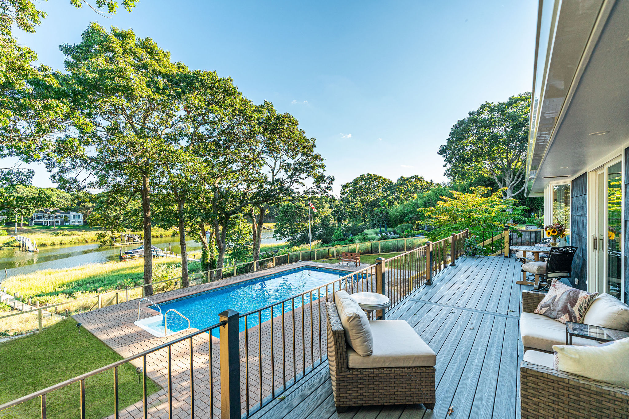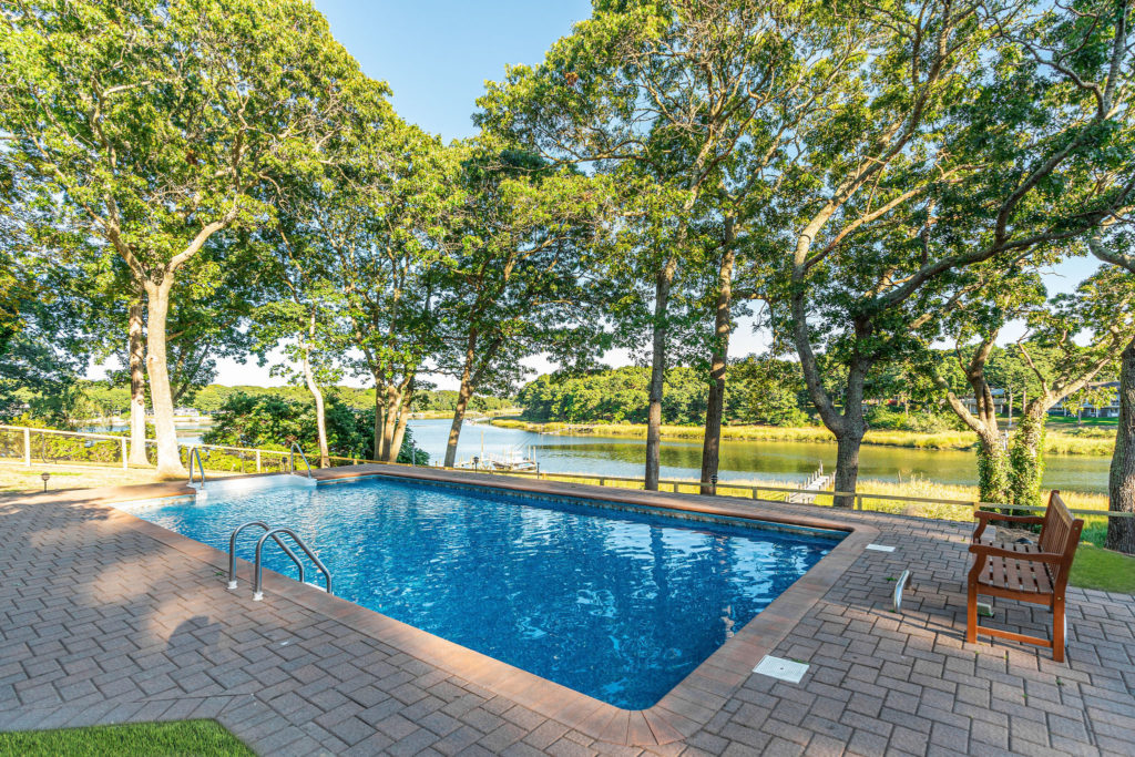 Sliders lead from the lower level to the patio and to the heated saltwater pool that overlooks the Mattituck Inlet. There is also a deepwater dock that can support a large vessel with 5 feet at low tide.