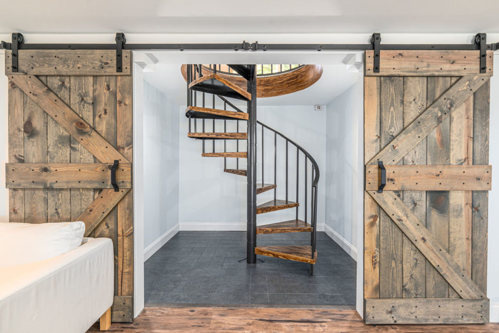 Head down the spiral staircase to the lower level that boasts a family room with a fireplace and a wet bar, a bedroom, and a full bathroom with a steam shower.