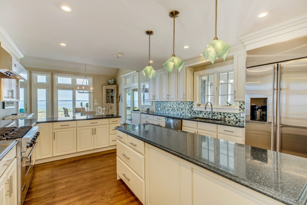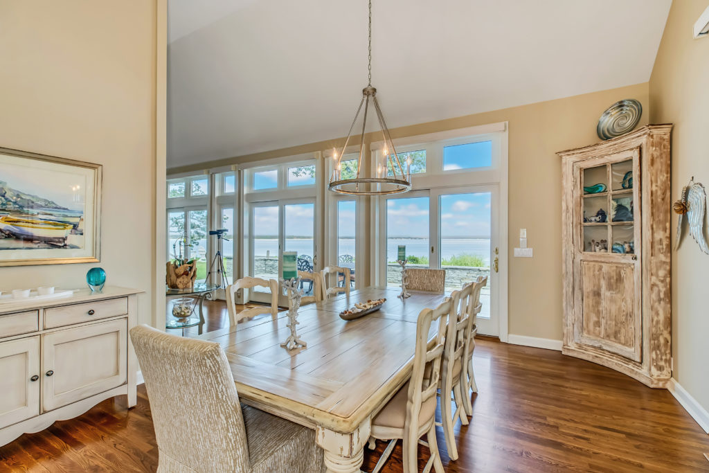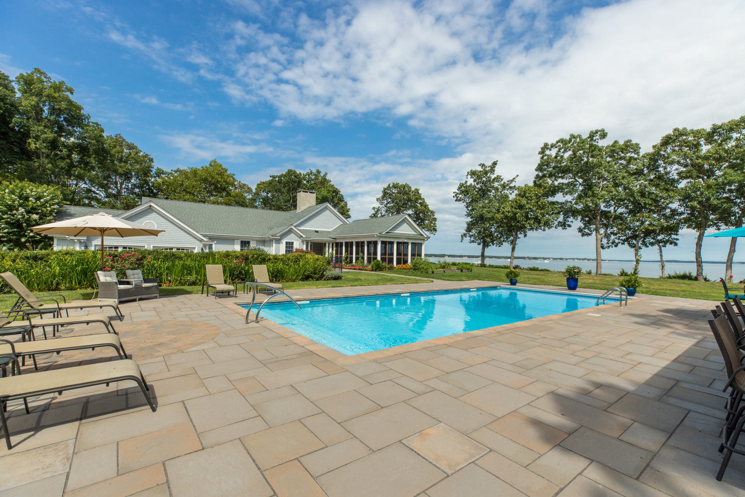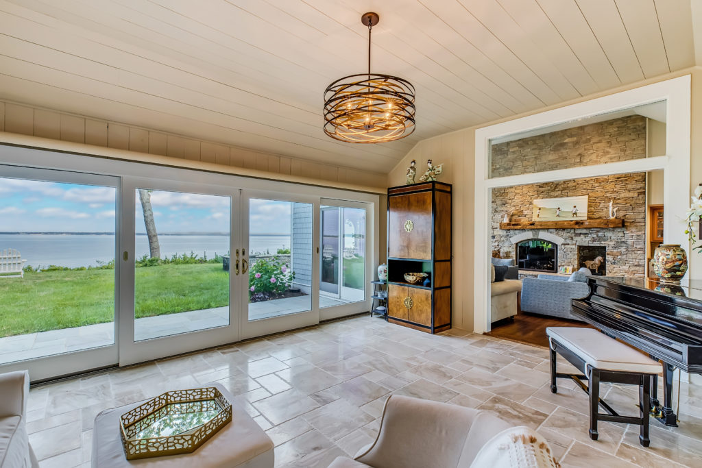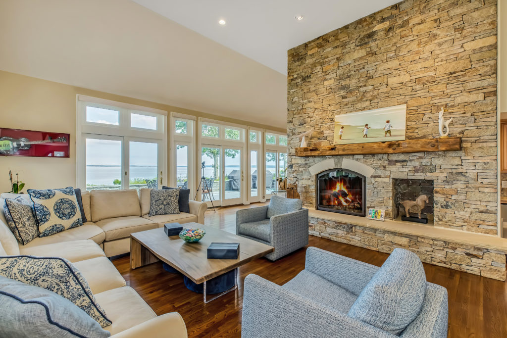 There are multiple living spaces many with spectacular views of Shelter Island and the South Fork including a huge sunroom and a great room with a massive floor-to-ceiling stone fireplace. Sliders and doors are found across most of the water-facing side of the home for seamless indoor-outdoor living.
