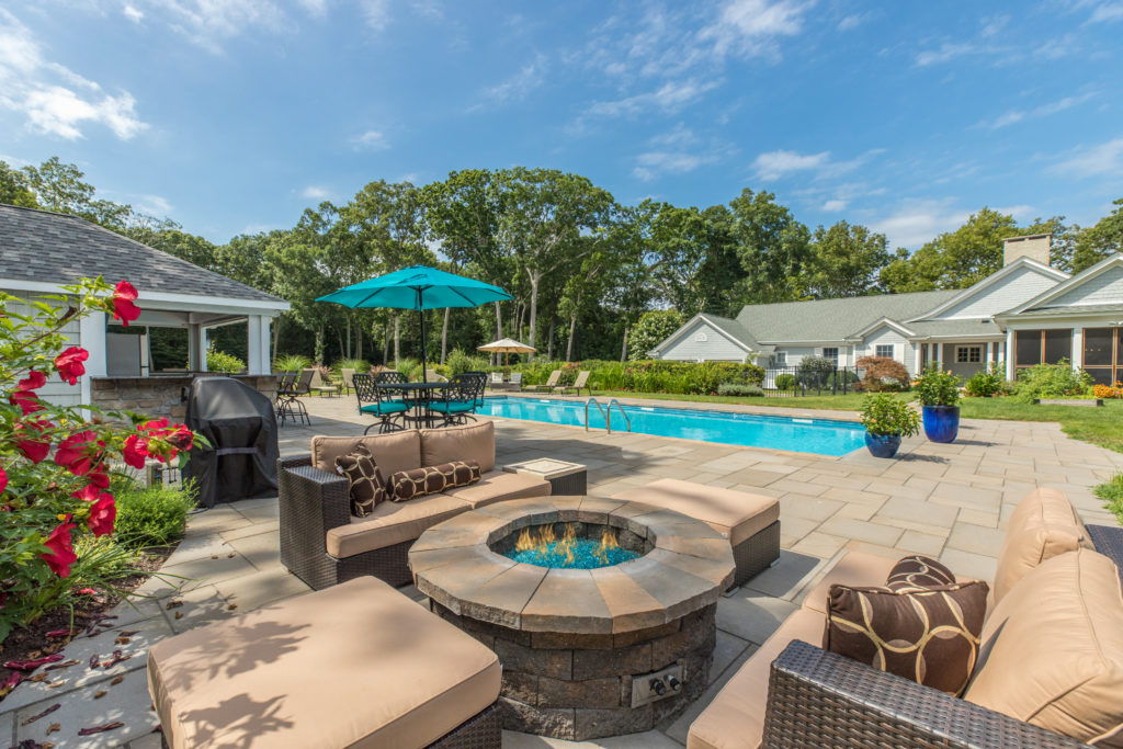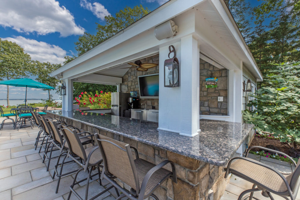 The pool house features a wet bar, refrigerator, TV hook-up, and a wrap-around bar with a granite countertop. The patio surrounding the pool and pool house is spacious enough for multiple dining and sitting areas.