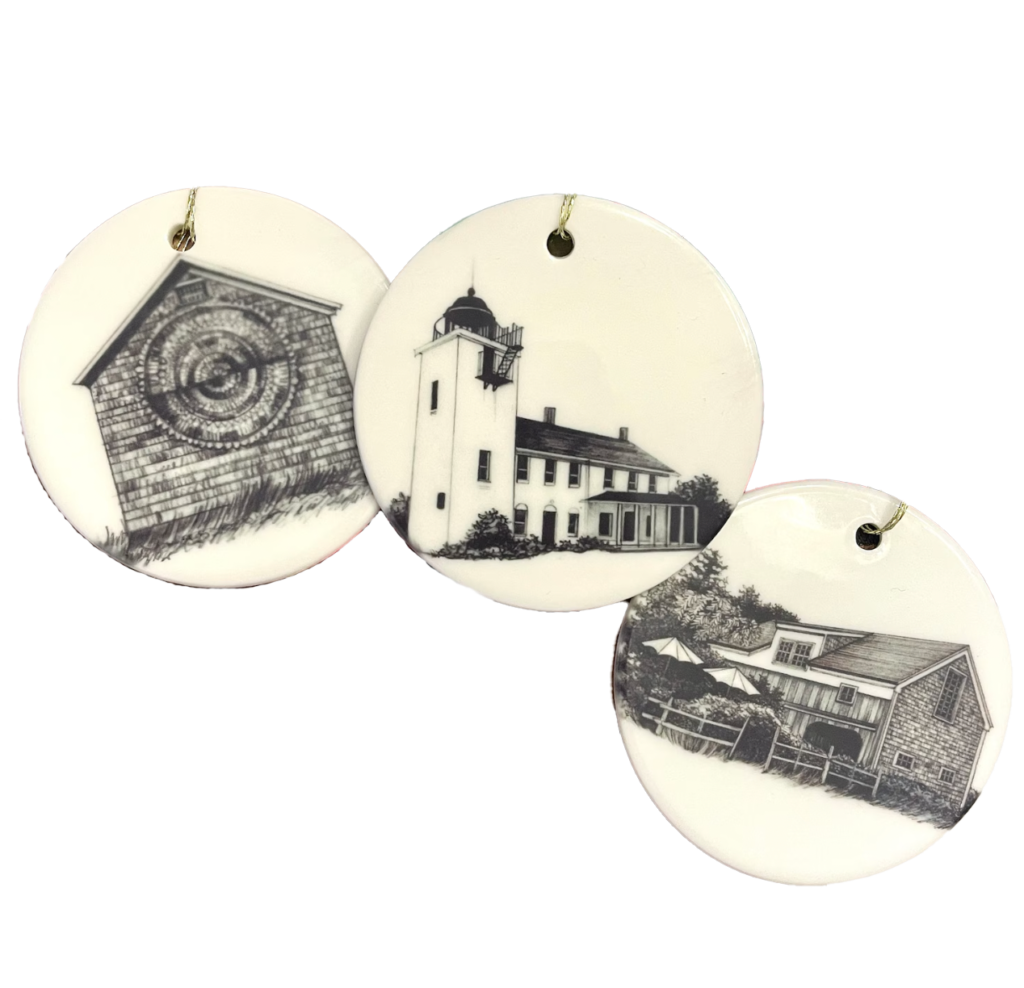 Local Artist Kelly Franké has put out her first collection of North Fork porcelain village ornaments this winter, featuring over seventy iconic, local spots. Choose your favorite at her Etsy store, $20 each.
