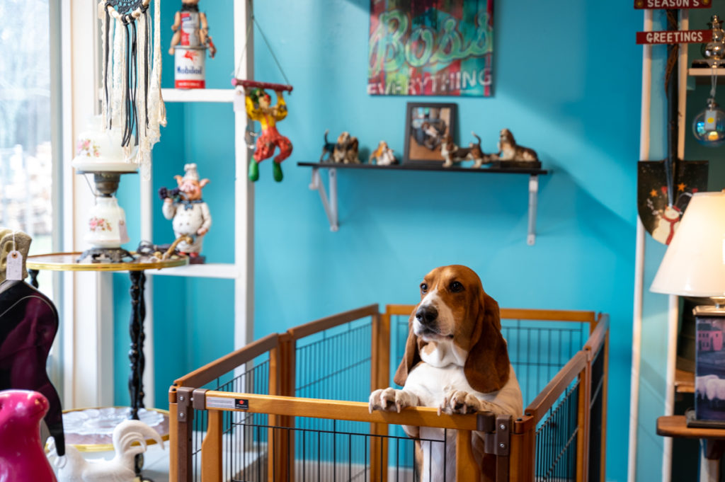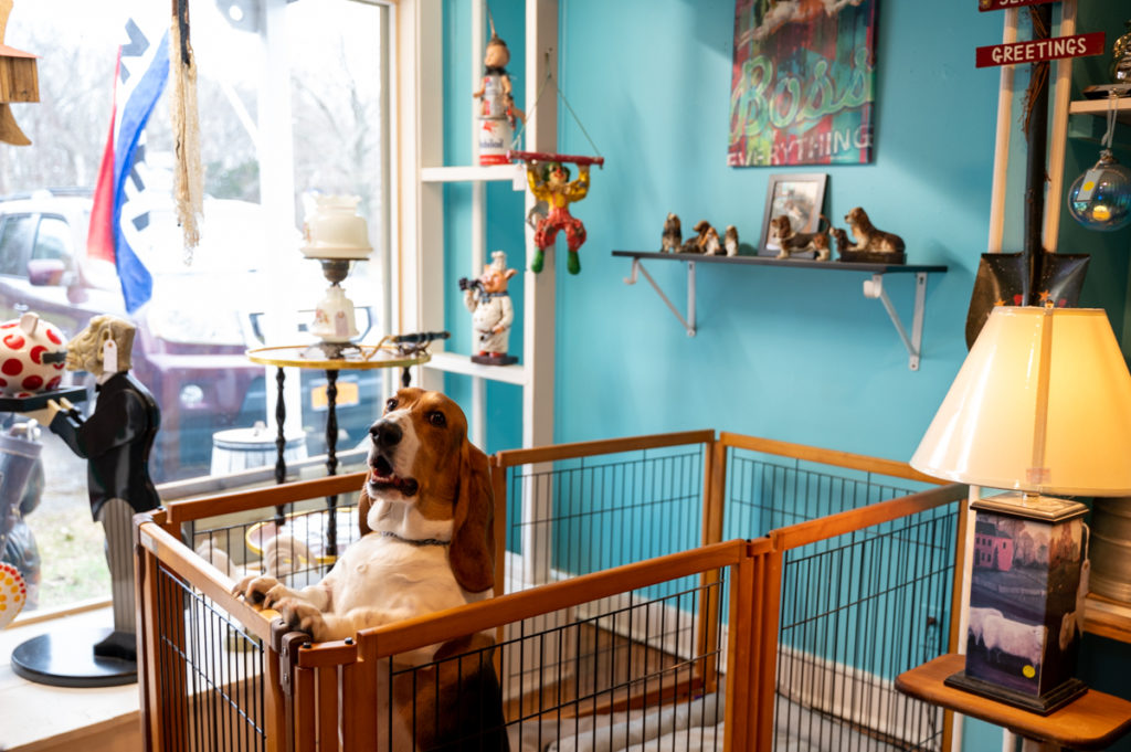 Also not for sale — although people would love to take him home — is Albert, Mannino’s 2-year-old basset hound. Above the furry friend’s blanketed pen hangs a shelf boasting a framed photo of him and Mannino, surrounded by basset hound figurines.