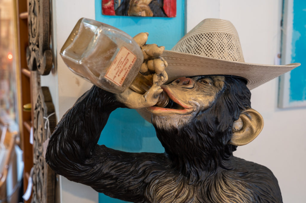 Mannino displays figurines and other novelties upon antique furniture. Such heartfelt scenes are broken up with more humorous paraphernalia, such as a drunken monkey.